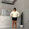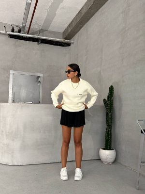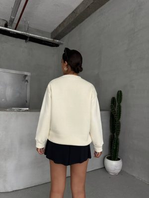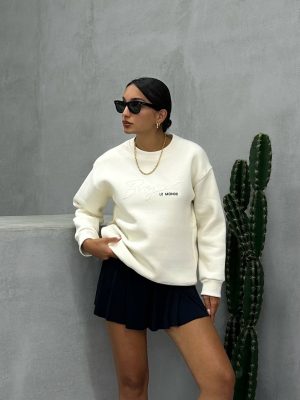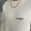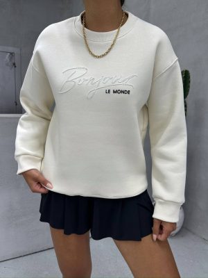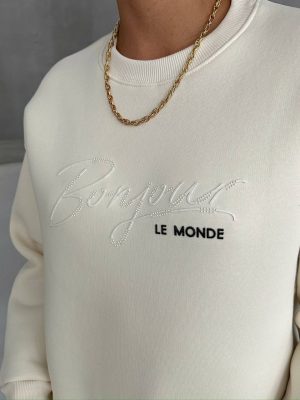 Creme-weißer Pullover mit der Aufschrift "Bonjour Le Monde"