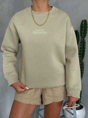 Dieser elegante Pullover in sanftem Beige trägt den inspirierenden „MOVE FORWARD“ Schriftzug und ist der perfekte Begleiter für deinen aktiven Alltag.