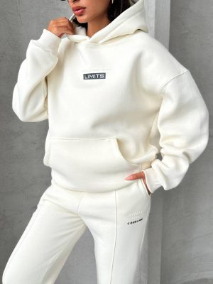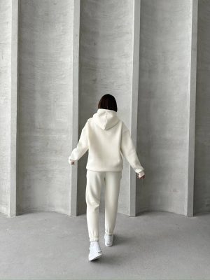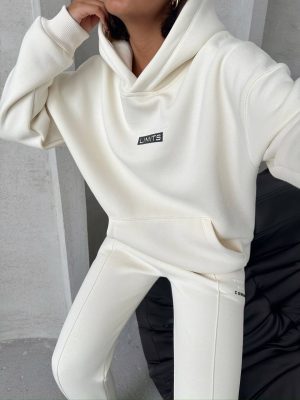 Dieses stilvolle Set in zartem Cremeweiß-Ton ist die perfekte Kombination aus Komfort und modischem Chic. Es besteht aus einem Kapuzenpullover und einer passenden Jogginghose, die zusammen einen harmonischen und bequemen Look ergeben. Ideal für den Alltag oder entspannte Freizeitaktivitäten.