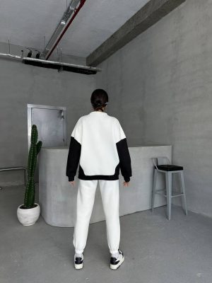 Dieses stylische und bequeme Set besteht aus einem Sweatshirt und einer Jogginghose, die perfekt aufeinander abgestimmt sind. Das Set ist zweifarbig gestaltet, wobei das Oberteil und die Hose in Weiß gehalten sind und mit kontrastierenden schwarzen Akzenten versehen sind.