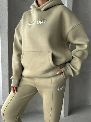 Der Hoodie und die Jogginghose sind mit dem einfachen, aber modischen Design mit der Aufschrift “WAKE UP!” in einem futuristischen, pixeligen Design bedruckt