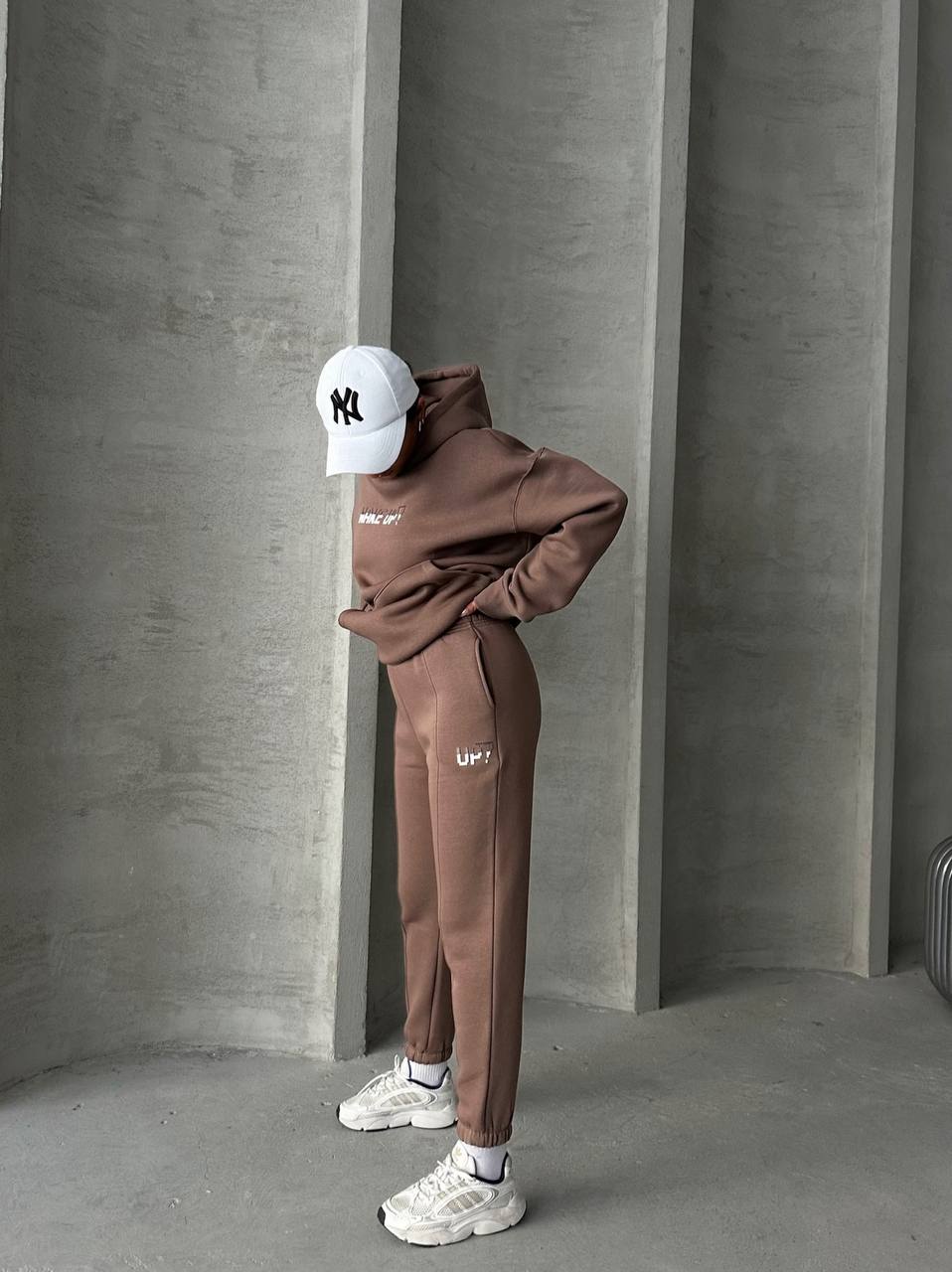 Der Hoodie und die Jogginghose sind mit dem einfachen, aber modischen Design mit der Aufschrift "WAKE UP!" in einem futuristischen, pixeligen Design bedruckt